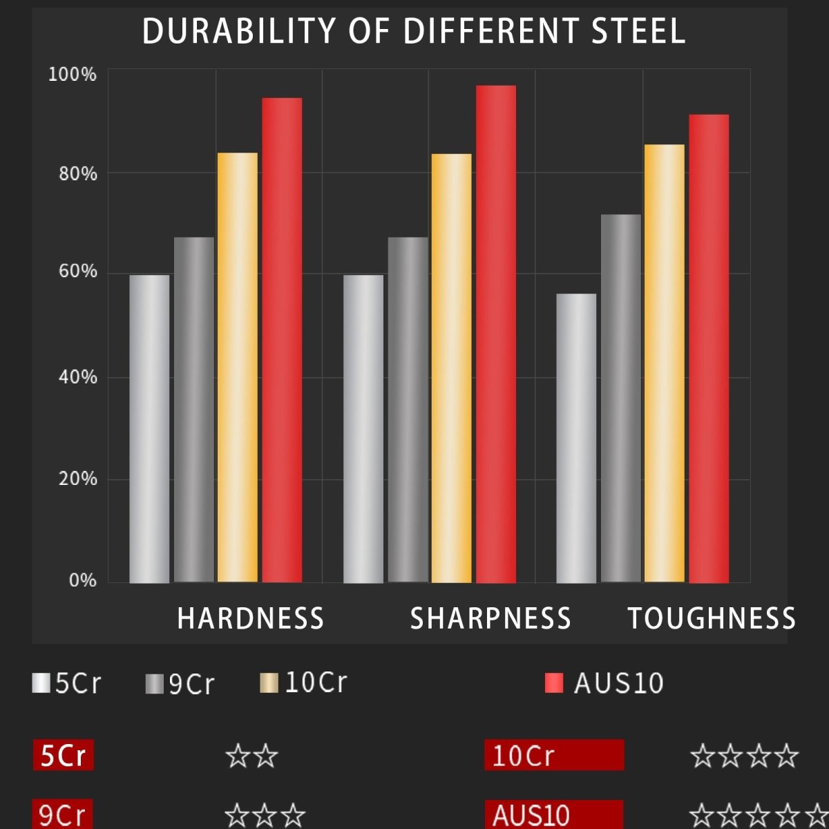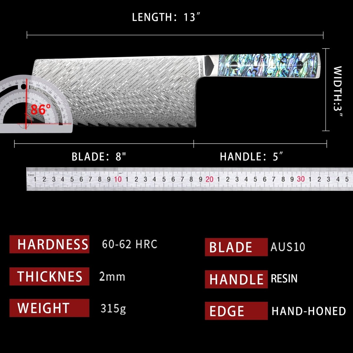 Our blade is full tang, extending into the handle for added strength and even weight distribution. Just fit your hand well for tireless cutting. The resin handle with exquisite abalone shell finish is beautiful, durable,anti-slip, and easy to grasp.