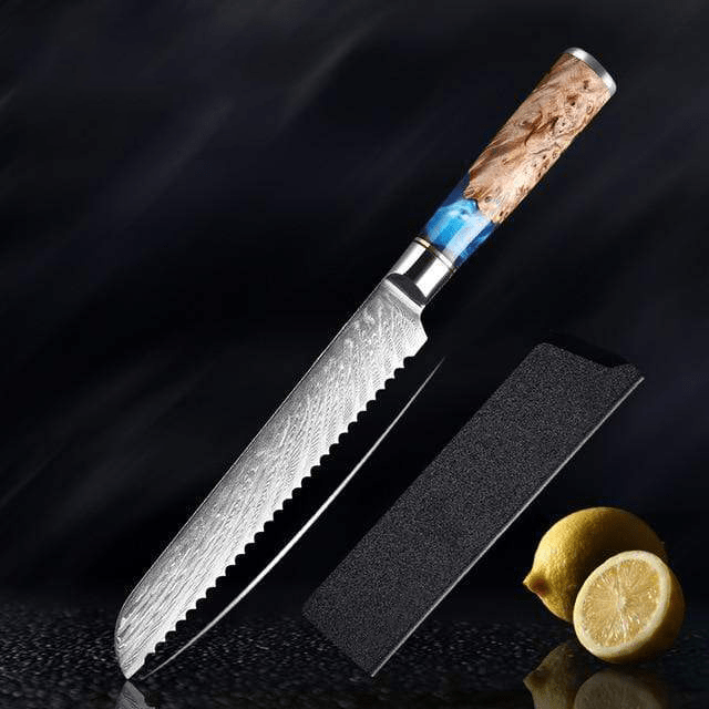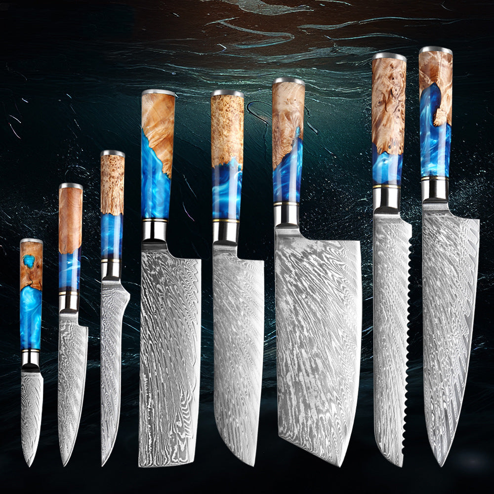 These knives feature made-to-order handles to match the fine steel. Pressure-treated wood combines with a strong blue resin to form a sturdy grip for a balanced blade. Each natural wood slab is unique, so the resin sets to form a different gorgeous handle for each knife.