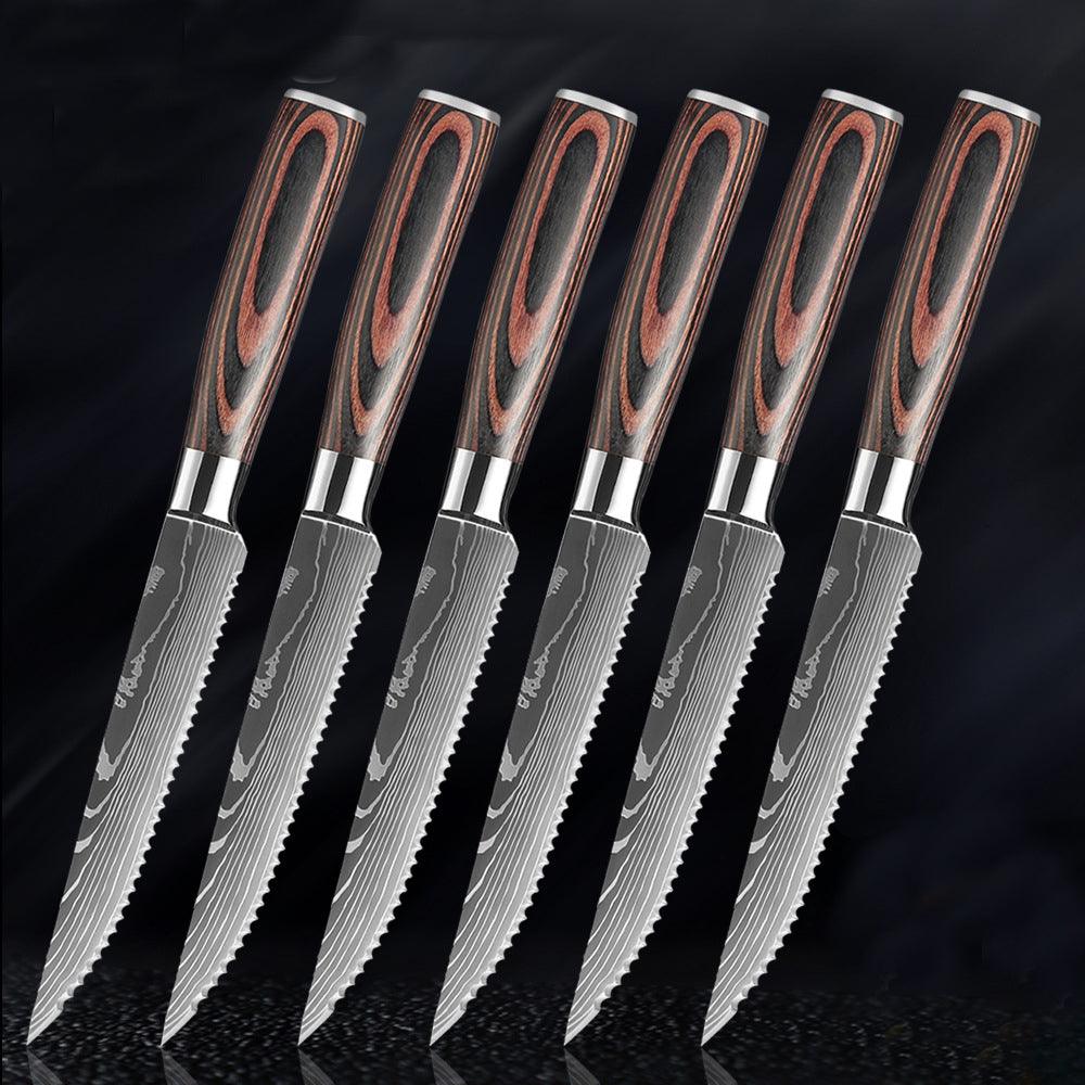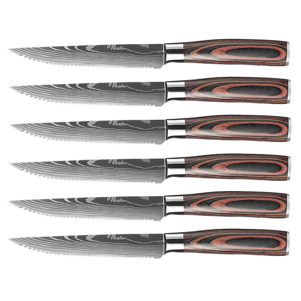 - Impressed your friends when you hold a gathering party: Imitation Damascus pattern with the color wood knife handle, processed with outstanding craftsmanship, cutting-edge technology, makes this serrated stainless steel steak knife so beautiful and special.