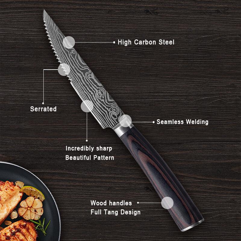- This Japanese steak knife set is crafted from high-carbon stainless steel blades. Outstanding craftsmanship, cutting-edge technology, rust-resistant, easy to maintain.