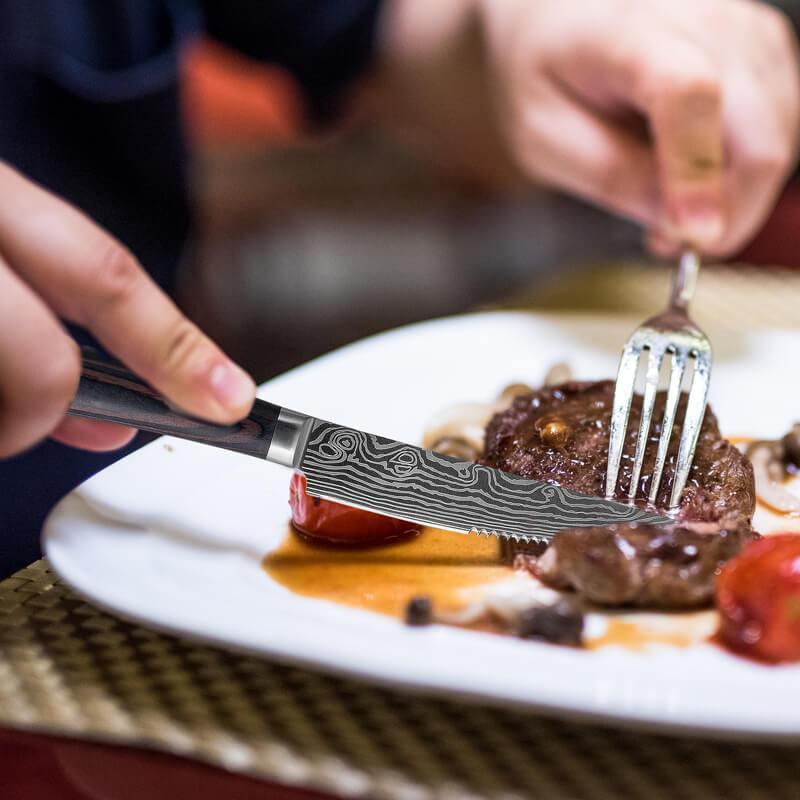 - This multi-functional Japanese steak knife set contains 6pcs/8pcs 5 inch steak knives, well for slicing and carving all types of meat, fruits.